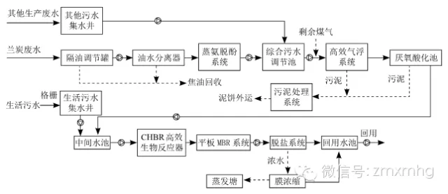 由北京清大国华环保科技有限公司开发,根据国内煤化工废水处理的现状,结合工程实践和兰炭废水处理项目的实际情况,按照“分类收集,分质处理”的原则,采用“预处理+厌氧酸化+混凝沉淀+平板膜生物反应器(MBR)”的优化组合处理工艺,在确保后续生化系统的稳定运行和出水水质达标的同时降低系统的运行费用。其工艺流程示意见图5。