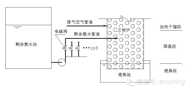 该技术将剩余氨水在自动控制系统的控制下从半焦炉的降温段注入炉内,利用降温段半焦余热将剩余氨水汽化,有机物和水蒸气一起进入高温区,水蒸气和煤层发生水煤气化反应后和有机物一起进入荒煤气中,荒煤气净化时有机物或者进入煤气,或者进入焦油中,得到全部回收。该技术在半焦熄焦前利用了半焦的余热,把汽化混合废水变成先汽化剩余氨水,炉内总的热平衡和水平衡基本不发生变化。该技术投资费用低,运行费用小,适用于现有直立炉的改造。