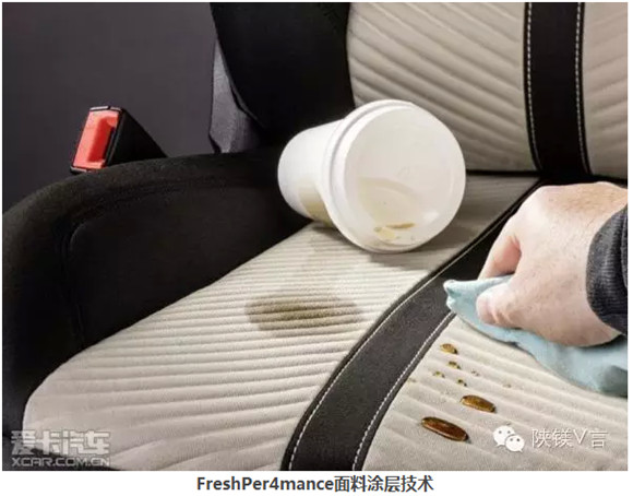 此外,为了使座椅套更容易清洁,目前已经出现了新的面料涂层技术。如图所示,左侧椅套面料未进行涂层处理,咖啡渍立刻渗入面料。右侧面料则采用了一种名为“FreshPer4mance”的涂层技术,咖啡在面料表面形成珠状体,用抹布轻轻一拭便不留痕迹。