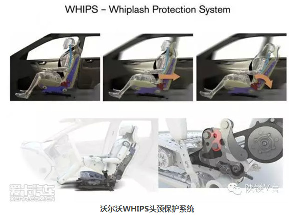 沃尔沃早在1998年就推出了名为WHIPS头颈部保护系统座椅,其椅背支撑结构可以均匀地承受乘员身体的重量。当汽车发生追尾时,座椅靠背和头枕还可以向后平行运动,使乘员的头部和上身处于平衡状态,减少身体向后倾斜而出现回弹(即鞭打现象)。