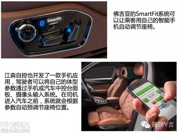 江森自控也在去年推出了一种座椅预调节系统,基于一项特殊算法,专用电机将会自动将座椅调整至兼顾舒适性与安全性的位置。为了使系统顺利运行和方便操作,他们还专门开发了一款手机应用,驾驶者可以将自己的体型参数通过手机或汽车中控台面板、摄像头输入系统。在司机进入汽车之前,系统就会根据参数自动预调节座椅位置。