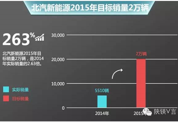 据陕电商了解,在刚刚过去的2014年,北京新能源累计销售6000余辆、上牌量达到5510辆,国内具有纯电动汽车生产资质的主机厂中名列第一,纯电动轿车率先实现了产业化。今年前4个月,北汽新能源累计销量突破4000辆,已接近2014全年的销量水平,占全国销量18.6%,力争年内实现2万辆的销售目标。