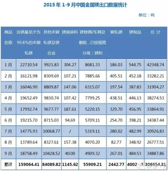 不过,从2015年年初开始,我国镁产品出口持续疲软。据海关总署统计数据显示,2015年1-9月我国累计出口各类镁产品共30.67万吨,同比减少5.82%,累计金额7.72亿美元,同比减少12.67%,结束了连续多年的增长势头。其中镁锭累计出口15.91万吨,同比减少5.27%;镁合金累计出口8.41万吨,同比增加3.64%;镁粉累计出口5.59万吨,同比减少15.68%。从出口产品结构来看,初级产品镁锭、镁合金、镁粉仍是出口主要品种,约占出口总量的97.5%,调整出口结构、提高出口产品附加值任重道远。