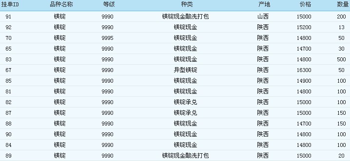 今日共有14条挂单信息,总可成交量为1663吨,成交价格中最高价为16300元/吨,最低价为14700元/吨,均价14986元/吨。