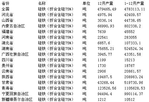 中商情报网监测数据显示:2012年1-12月,全国硅铁(折合含硅75%)的产量达478.3万吨,同比下降2.28%。2012年12月份,我国生产硅铁47.94万吨,同比增长43.89%。