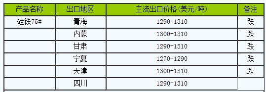 目前硅铁出口主流FOB75#报价在1300-1310美元/吨,硅铁72#FOB主流报价为1290-1300美元/吨。