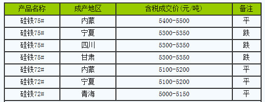 硅铁75#国内主流含税到厂价为5300-5350元/吨,内蒙等地区报价坚挺5400-5500元/吨左右,主流行情下跌50元/吨。硅铁72#国内主流含税到厂价为5100-5200元/吨,青海等地区报价偏弱在5000-5150元/吨左右,主流行情较为稳定。