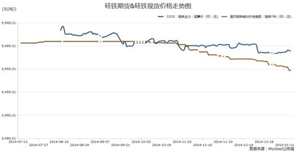 2014年从郑商所上市硅铁期货品种以来,硅铁主力1501的价格一直受到了业内人士的质疑,或高或低众说纷纭。小编并非期货界专业人士,但从观测的数据来看,期货1501的价格曲线图与现货1501的价格走势图,在最终交割时会价格曲线出现了吻合的现象。可以这么认为,硅铁期货给厂家们预判后期走势提供了非常好的参考标准,也为参与期货的硅铁厂家提供了保值空间。注:硅铁绝对价格指数为主产区自然块硅铁价格CZCE硅铁主力为合格块、带包装交割价总结从分析来看,2015年硅铁行业内企业将进入产业转型淘汰阶段。在解决贷款、融资等资金链问题之后,对内优化生产成本,提升产品品质,对外扩展海外渠道,运用期货工具,这是厂家们今年要解决的最大问题。