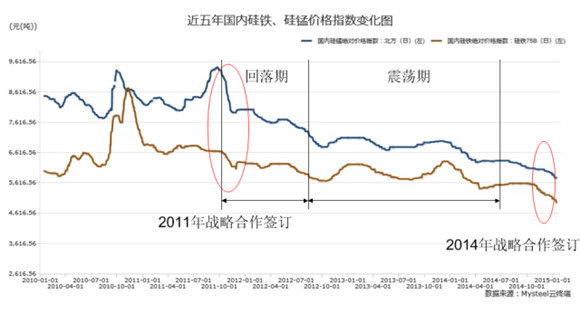 再观2014年签署的战略合作协议,与之前相似的是,虽然粗钢产量在增加硅铁产量在压缩,但是河钢招标却一直下跌,与2011年末行情如出一辙。也就是说,2015年硅铁行业将进入产业转型淘汰阶段,价格暂时还不会有大幅上涨的可能性。