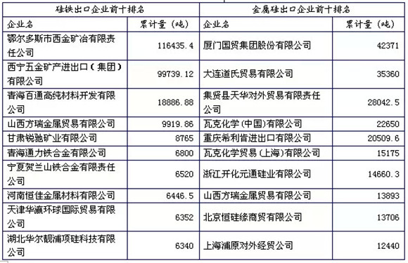 硅铁主要出口企业集中在内蒙、甘肃、宁夏、青海地区,贸易量超过总量的60%;金属硅出口企业主要集中在江浙沪沿海,贸易量占总量的30%左右。