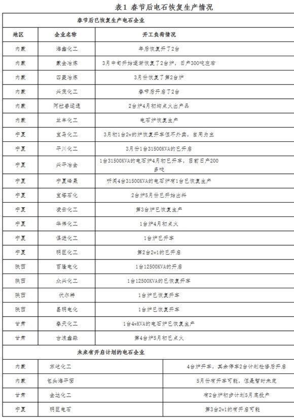 春节后至今,已有接近30台电石炉恢复生产或是已经点火后期产量恢复,外加白雁湖检修的4台炉计划5月10号恢复生产,双欣化学、鄂尔多斯化工因下游检修电石外卖量将增加,所以5月后期电石产量将会继续增多,电石供应将日益充足。