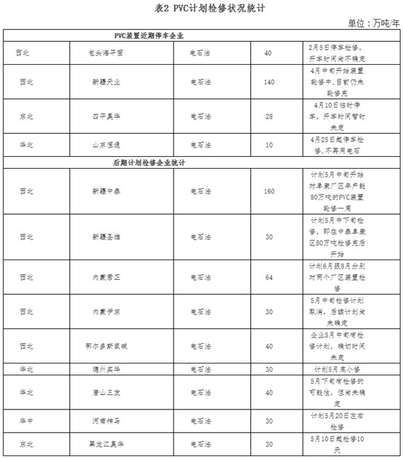 表2可以看出,5月份开始,PVC检修开始有增多,但也仍有一些企业未明确检修时间。电石需求量整体呈现下降趋势,一旦有较大型的企业集中检修,电石供需就会迅速失衡。