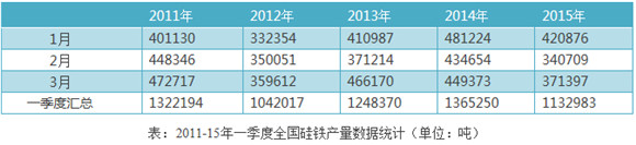 国家统计局数据显示,2015年全国硅铁总产量113.3万吨,同比降低17%。其中四大主产区:青海省一季度总产量24.6万吨,同比降低17.3%;宁夏地区23.9万吨,同比降低27.7%;内蒙古地区23.9万吨,同比增长6.5%;甘肃地区10.8万吨,同比下降20.2%。