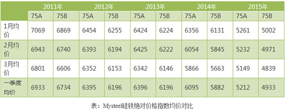 与同期相比,2015年一季度75A硅铁Mysteel平均绝对价格指数在5212元/吨,同比下跌14.5%;75B硅铁Mysteel平均绝对价格指数在4933元/吨,跌幅16.1%。