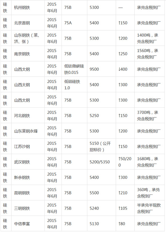 随着中旬的来临,国内大型钢企招标采购已逐渐进入尾声。从招标结果来看,采购价格的大幅上涨对于硅铁市场价格的上行形成支撑。从招标过程来看,钢企的继续下跌,使得钢企出现定价难的问题。随着6月招标的结束,硅铁市场价格也逐渐稳定,而对于后市价格将何去何从,业内对于7月钢企招标也表示高度关注。(河北钢铁包含:唐山不锈、邯钢、宣钢、承钢、舞钢、石钢、唐钢、唐山中厚板)
