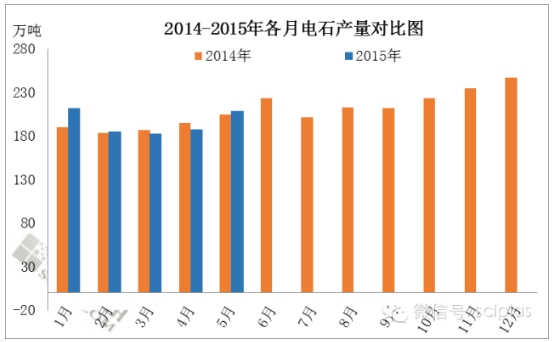 2015年电石产量并不稳定,忽高忽低,同比环比均无明显规律可言。产量的变化主要受到电石价格波动的影响,同时,产量的变化又直接影响到价格。二者之间互相影响带来了今年跌宕起伏的价格走势。数据显示,2015年1-5月份电石总产量在996.9万吨,同比增加4%。2015年前5个月中,产量最高的月份为1月份,月度产量在211.4万吨,而1月也是电石价格持续下降至2007年以来最低位的时候,产量与价格持续呈现明显的负相关性,可见,电石市场受影响最大的仍是供需关系的变化。
