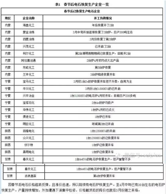 大幅上涨阶段(春节后至4月中旬):春节后价格开始迅速上涨,截止4月中旬总共上涨了9轮左右,涨后价格在天津地区接收价格2930元/吨,涨价以来总计上涨450元/吨;山东德州接收价格在2960元/吨,涨价以来总计上涨了500元/吨。电石出厂价格也从春节前的接近2000元/吨一路涨至2600-2650元/吨。涨价主要因春节前价格过低,电石炉停车过多,产量明显下降,所以节后超跌反弹,不断涨价以刺激电石炉开启。