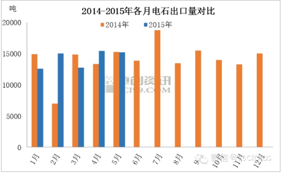 2015年电石出口量整体略高于2014年,但并无大的改变。1-5月份电石总出口量为7.09万吨,同比增加8.79%。因电石出口量占比偏小,所以对国内市场的影响微乎其微。