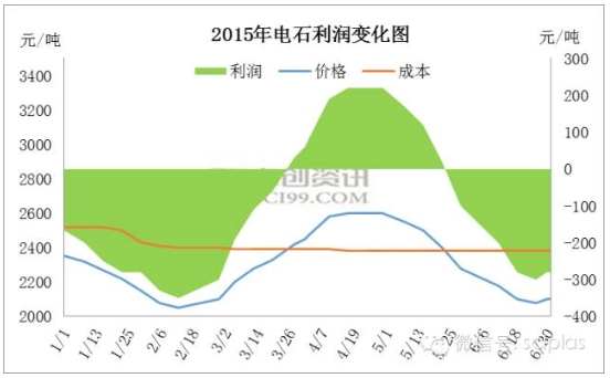 进入2015年,电石原料兰炭、白灰价格持续低位,电价各地状况不一,整体变动不大,所以电石成本延续了2014年的水平。从上图可以看出,2015年电石平均利润仍是负值,仅有3月下旬至5月中旬不到2个月的时间企业处于盈利状态。但需要注意的是,仅有的2个月的盈利时间里,有一些电石厂是刚刚恢复生产,还未开始收回开炉成本,或是盈利还非常有限,就已经重新遭遇了新一轮电石价格的下滑。所以多数电石企业在2015年生存仍极为艰难,未见到足够的胜利曙光。