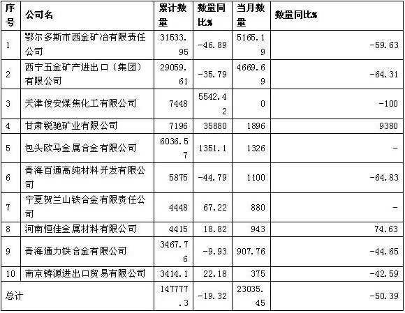 2015年上半年鄂尔多斯西金矿冶集团出口硅铁3.15万吨,暂居第一;西宁五金矿产进出口(集团)有限公司出口2.91万吨,居于第二;天津俊安煤焦化工有限公司,以7448吨排名第三。