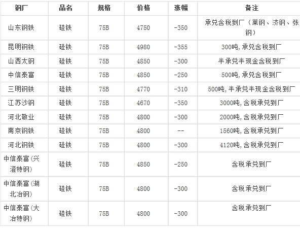 由于国庆节的来临,钢厂的招标也纷纷提前,在国庆节前已经有包括河钢在内的钢敲定了本月的硅铁招标价。在节后钢厂也陆续开展硅铁招标,截止到目前已经有多家钢厂敲定了硅铁招标价。钢厂品名规格价格涨幅备注