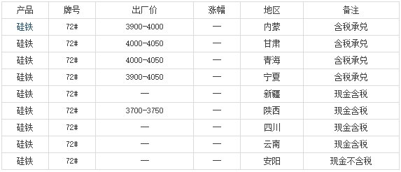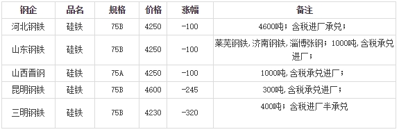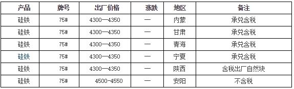 钢厂陆续敲定了本月的硅铁招标价格,自河钢在昨日敲定本月的硅铁招标价格之后,已经敲定的硅铁价格显示硅铁招标跌幅减小。河北钢铁、山东钢铁12月份75B硅铁招标价格均下跌100元/吨至4250元/吨,山西晋钢75A硅铁招标价为4300元/吨,也下跌了100元/吨。