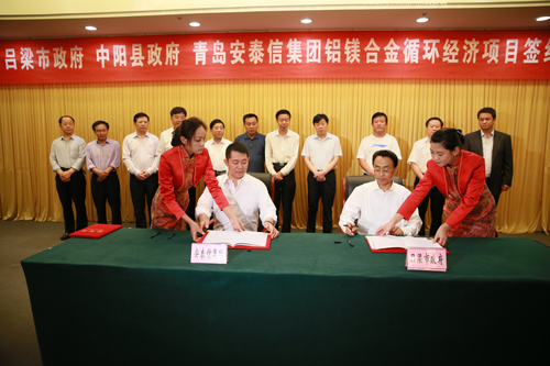 9月12日下午,吕梁市政府、中阳县政府、青岛安泰信集团铝镁合金循环经济项目签约仪式在吕梁国际大酒店举行。市长丁雪峰与中阳县有关领导分别代表市县两级政府与青岛安泰信集团签约。市委常委、副市长郝月生,副市长李润林,市政府秘书长梁斌,青岛安泰信集团董事长王志军出席签约仪式。