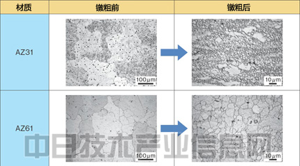 利用动态再结晶现象使晶粒微细化。AZ31虽然局部残留有较大的晶粒,但绝大部分变成了5μm左右的晶粒。AZ61的晶粒虽然比AZ31稍大,但镦粗加工后也实现了微细化。