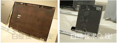 以前产品的顶板只是采用镁合金压铸材料,而MX3系列采用了在中间夹入新开发的碳纤维发泡材料的“三层结构”(两层发泡预浸材)。另外,通过将顶板的局部加厚(设置突起部分)等,在确保面强度的同时,将重量减轻了14%。此外,光驱单元通过在壳体开孔等方法,减轻了34g。