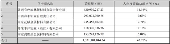 前五名供应商合计采购金额(元) 1,331,101,044.34