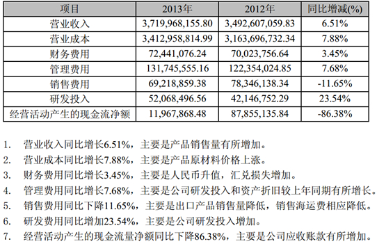 2013年,公司积极开拓市场,加大了新产品开发、技术开发力度,主营产品镁合金和铝合金销售量比去年有所增加,2013年公司实现营业收入371,996.82万元,较上年同期增长6.51%。2013年公司加强了集团总部的管理职能与监督职能,在各子公司推广了SAP管理软件的实施,对各项指标进行刚性管理,同时公司加强了对各子公司利润的考核,2013年南京云开合金有限公司、南京云海轻金属精密制造有限公司等子公司利润有大幅增长。2013年销售费用比去年同期降低了11.65%,实现归属于上市公司股东的净利润2,534.75万元,较上年同期增加27.77%。