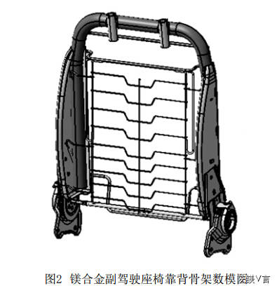 原副驾驶座椅骨架为钢件,由靠背骨架、座垫骨架及滑轨组成。受到原型车改制的局限,并依据轿车座椅的法规要求,为满足原车性能要求,本项目中的副驾驶座椅骨架的镁合金替代仅限于靠背骨架。该骨架主要采用挤压、弯曲和冲压工艺制造,镁合金件之间采用氩弧焊连接,不同材料零件之间采用结构胶粘接并用铝螺栓增加连接的可靠性。