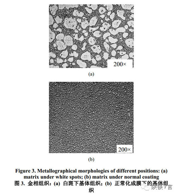 由于先析α相无Al或低Al保护,故在活化阶段发生腐蚀溶解而形成弧状下凹,且膜层生长速度较慢,膜层较薄。先析α晶粒尺寸较大,表面平整,接近镜面反射,成为白斑。而正常的组织由共晶(α + β)组成,易散射,故不能形成白斑。
