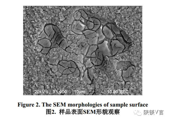 正常的化成膜与白斑处的转化膜存在很大的差别:正常的化成膜,膜层致密平整,“晶粒”尺寸均匀,裂纹分布一致;而白斑处的表面形貌呈岛状,岛状白斑尺寸大小不一,分布于正常的化成膜之间。