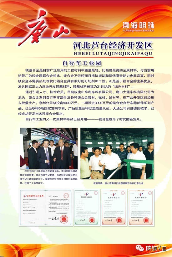 作为国家级自行车零部件产业基地、省级镁合金特色产业基地,芦台经济开发区在镁合金、碳纤维、碳镁、碳铝复合材料在自行车行业的应用方面技术领先。陕镁电商了解到,该区积极支持自行车零部件产业发展,并利用地域优势,纳入天津未来五年的《自行车产业发展规划》,与天津自行车电动车行业协会签署了《共建“自行车科技产业园区”战略合作框架协议》,将以科技创新为支撑,打造集研发、生产、展销为一体,具有国际化、品牌化特色的新型现代自行车产业园区。