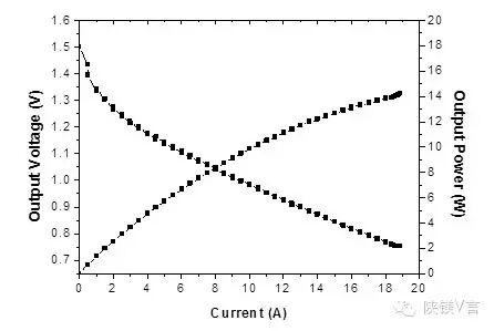 中国科学院宁波材料技术与工程研究所动力锂电池工程实验室在优化阴极空气扩散电极的结构与制备工艺,以及开发高性能的锰氧化物氧还原催化剂的基础上,成功研制出1000Wh镁空气电池样机,详见图1所示。该电池由5个单体电池串联而成,以AZ31镁合金为阳极,以10%的NaCl溶液为电解液,以上述空气扩散电极和锰氧化物催化剂为阴极。该镁空气电池的外观尺寸为200×150×150mm3,重量为2.3kg,能量密度可达430Wh/kg,最大输出功率可达80W,其单体电池的I-V曲线如图2所示。上述镁空气电池具有较好的商业化前景,可应用为野外供电电源、移动电源、备用电源和应急电源等。