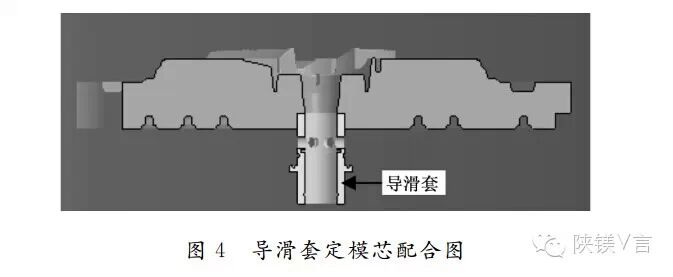 针对生产过程中出现的冷隔、夹杂、裂纹等缺陷,分别通过调节金属液温度或者模温机的温度"使用更加纯净化的金属液、加大连接处圆角或者调节模温的均匀性等方法来改善。而对于轮心处变形的问题,因为补压杆后退再开模跟踪会影响生产效率!解决方案为:①对补压杆通冷却水并周期性的施加润滑油;②补压杆的导滑套加长伸入定模芯一部分(见图4)减少金属液包裹补压杆的长度,这样补压杆就不用后退可直接跟踪开模。通冷却水以及润滑油在不降低生产效率的同时增加了补压杆的寿命(补压杆长时间与金属液接触,温度一直过高容易拉毛,不但配合容易出现问题,而且影响真空通道的关闭)。