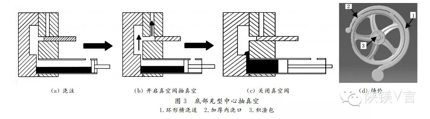为解决上述问题,本课题组采用卧式压铸底部充型中心抽真空轮心处补压的成形工艺(见图3),以期获得具有高品质的摩托车轮毂铸件。