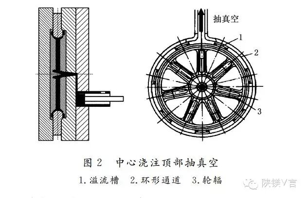 轮毂浇注系统采用中心浇注顶部抽真空方式进行,这种充型方式决定了轮毂铸造模具最好采用垂直分型,这样不仅能使金属液均衡充型,方便排溢系统设计,而且能够对轮心厚大部位进行压力凝固补缩,有利于提高轮毂铸件致密度,减少缩孔、缩松缺陷。若在冷室压铸机上采用中心充型顶部抽真空方式(见图2)那么,模具需设计成三片两开式结构,不仅增加了模具成本,而且会降低生产效率,压头只能为轮心热节提供有效补缩,而分布在轮缘上的热节因薄壁轮辐较早凝固堵塞补缩通道而出现缩孔、缩松等缺陷,降低其力学性能。即使采用真空压铸工艺也无法降低轮缘上因热节而产生的缩松等缺陷(真空压铸可减少甚至消除压铸件中的气孔,铸件中的缩孔、缩松只能通过改变结构或者补压来解决)。有时为了保证轮辋在压力下凝固,减少轮辋部位的缩孔,需要使轮毂按照轮辋-轮辐-轮心的顺序增加壁厚,这样造成轮辐处及轮心部分的材料有一定的浪费,在后续机加工去除(如轮心)或保留在轮毂产品上(如轮辐),这不仅增加了成本,而且也增加了轮毂质量,与应用镁合金减重以及压力铸造的初衷相悖。更重要的是轮辋是轮毂产品的高应力区,要求的充型品质最高,但中心浇注方式最后充填轮辋,致使氧化渣、冷隔、流痕等缺陷出现在轮辋上,降低了轮毂铸件的工艺品质和力学性能。传统的卧式冷室压铸机中心充型顶部抽真空轮毂成形工艺通过在轮缘上面开设溢流槽,并通过环形通道把溢流槽与真空通道连接,这样来抽取型腔内的气体。一方面这种工艺方法开设溢流槽和环形通道会显著降低轮毂产品的工艺出品率,增加生产成本;另一方面环形通道曲折小截面的特点不利于快速抽真空,这样的通道已经形成了抽真空的瓶颈,尾部的大截面、直通径的真空通道也无效果。