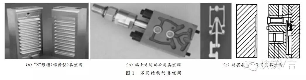 真空压铸尤其是高真空压铸技术的瓶颈及难点之一是真空截止阀的结构及真空系统的设计。真空截止阀的主要作用有二,一是给型腔中的气体提供一个排出的通道;二是在抽出气体后及时关闭,阻止金属液体进入真空通道。图1为不同结构的真空阀。按其工作原理主要可分为3类:①改变通道的截面积,使金属液的流动性逐步下降(如果需要,可以通水冷却使其流动性下降),而在进入真空管道前金属液的流动自然停止,如“Z”形槽(锯齿型)的真空阀(见图1a);②通过检测型腔中金属液的充填位置,利用液压或气压使真空阀关闭;③利用金属液的惯性冲击力使真空阀的排气通道关闭,如瑞士方达瑞公司和赵芸芸等设计的真空阀(见图1b、图1c)等。