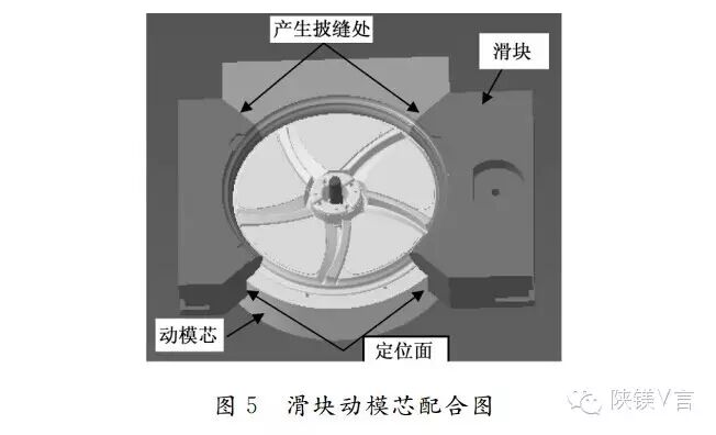 生产中采用动模芯与4个滑块的配合面进行定位(见图5),刚开始生产的时候没有问题,可是生产一段时间由于夹杂等一些污物跑到定位面的位置导致4个滑块不能完全合紧,在接触的地方产生披缝,并且此处开模后喷枪也不能扫到,很难清理。只有采用4个滑块接触的地方作为定位面原来的定位面为了防止干涉单边退后50µm,这样就可以解决污物在定位面累积造成无法精确定位的问题。