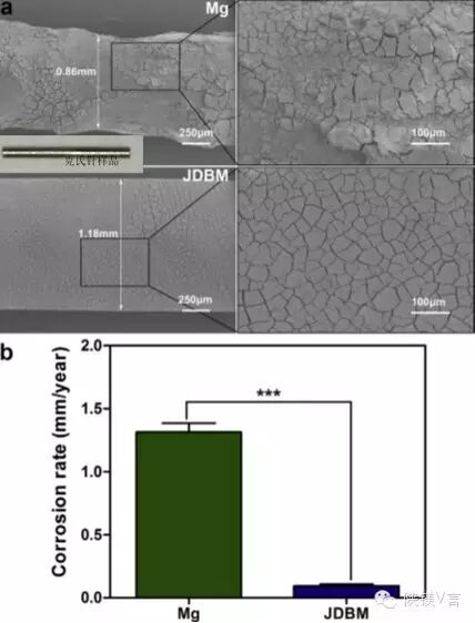 图a为JDBM镁合金和纯镁克氏针样品植入大鼠股骨髓腔中4周降解后的形貌比较(JDBM显示均匀降解;纯镁显示不均匀降解特征);图b为相应的植入4周后的降解速率,显示JDBM具有更优异的抗均匀降解性能。(摘自Fig.8,Biomaterials53(2015)211-220)