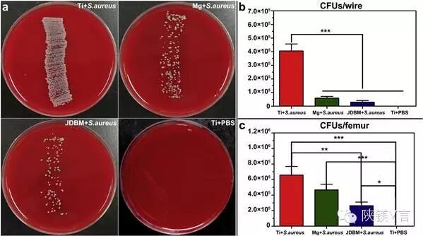 植入物表面及股骨中所含的细菌(a)从大鼠股骨中取出的Ti、Mg和JDBM克氏针滚板后的细菌培养图片;(b)克氏针滚板后,涂板计数表面粘附的细菌;(c)股骨研磨成粉,涂板计数其中所含的细菌。结果显示JDBM镁合金具有显著的抗菌效果。(摘自Fig.6,Biomaterials53(2015)211-220)