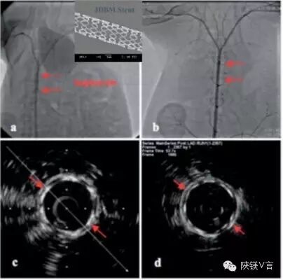 JDBM镁合金心血管血管支架刚植入初期的血管造影(图a)及其IVUS图(图c);植入16周后对应的血管造影(图b)及其IVUS随访图(图d),显示16周后JDBM支架贴壁良好,仍保持血管支撑作用,无内膜增生等不良现象。(摘自:Fig.4,Nanoscale5(20)2013:9517-22)