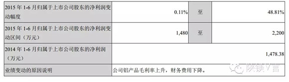 1、2015年1-3月归属于母公司所有者的净利润较上年同期增加101.04%,主要是财务费用下降及铝合金产品毛利有所提升。