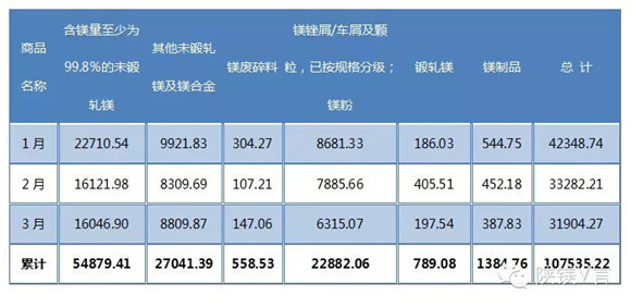 根据海关总署最新统计数据,2015年第一季度,中国累计出口各类镁产品10.75万吨,同比下降3.51%。