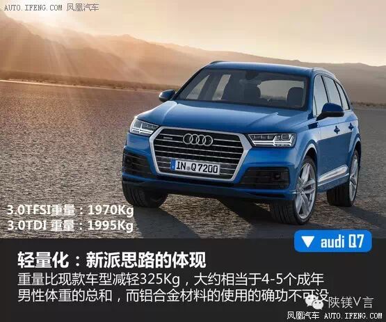 更多的轻量化范例同平台/架构设计相结合。新一代奥迪Q7采用大众MLB(Modularer Längsbaukasten)发动机纵置平台的“多材料”版本,使用钢、铝和碳纤维等结构件,加上车身加工工序的新铆接和粘合技术工艺,新车较上一代减重350千克。第二代沃尔沃XC90以SPA可扩展架构为基础,较上一代车型减轻125千克。第六代宝马7系采用新后驱平台,整备质量从现款7系的1.9吨降低至1.67吨左右,和现款5系相当。
