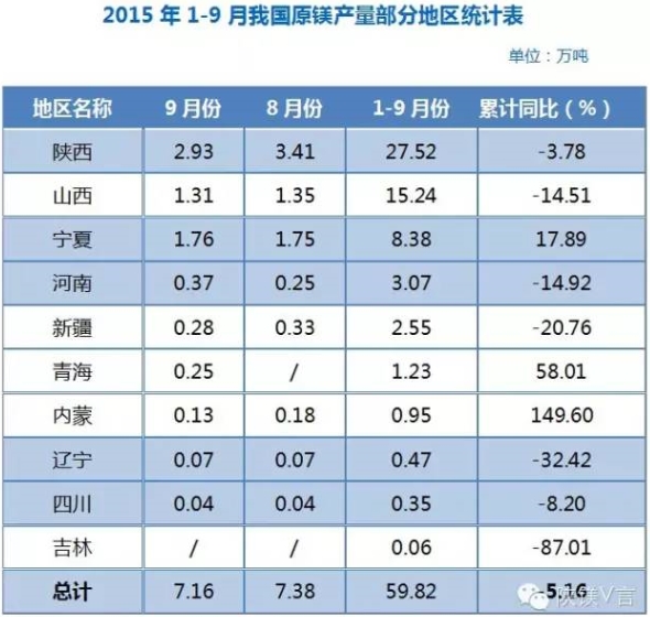 但是,进入2015年后,伴随着消费增长乏力,兰炭等与镁行业发展相关产业的持续疲软,镁产量出现负增长。据中国有色金属工业协会统计数据显示,2015年1-9月中国共产原镁59.82万吨,同比减少5.12%。分地区统计来看,陕西、山西、宁夏仍是我国原镁主产区,除宁夏地区保持微量增长之外,山西地区产量出现持续大幅下滑,而陕西地区结束了连续多年的高速增长转而出现负增长。目前行业停产减产比较普遍,镁价低位盘整,下游行业市场保持低迷是我国原镁主产区产量下降的直接原因。