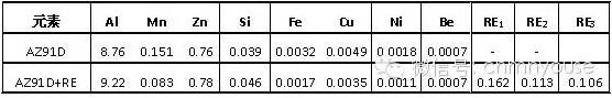 所用Z91D与AZ91D+RE试样的化学成分见表。